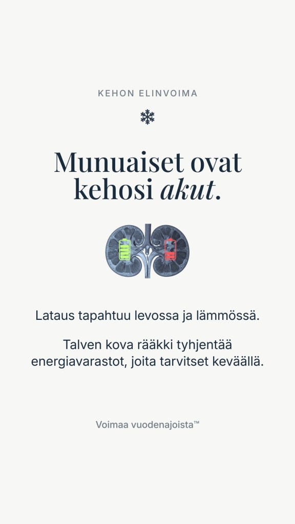 Talvi on keholle lepokausi, ei rääkkäysjakso. Kun ajattelet kehoasi sisäisenä akkuna, ymmärrät, miksi se tarvitsee talvella erityistä suojaa. Uni, lepo ja lämpö eivät ole luksusta, vaan välttämätön investointi tulevaan kasvukauteen.