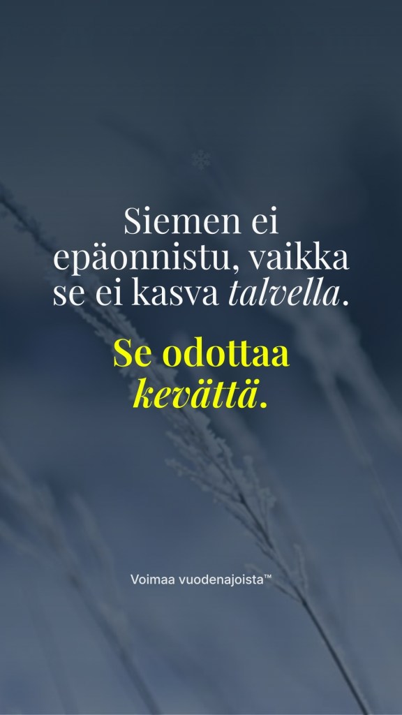 Länsimainen kulttuuri on tehnyt uudenvuodenlupauksista tahdonvoiman testin. Jos voimat hiipuvat helmikuuhun mennessä, olo on helposti epäonnistunut. Vuodenaikojen näkökulmasta tarina on kuitenkin toinen. Siemen ei ole epäonnistunut, jos se ei kasva helmikuussa – maa on vain vielä jäässä, ja se odottaa kevättä.