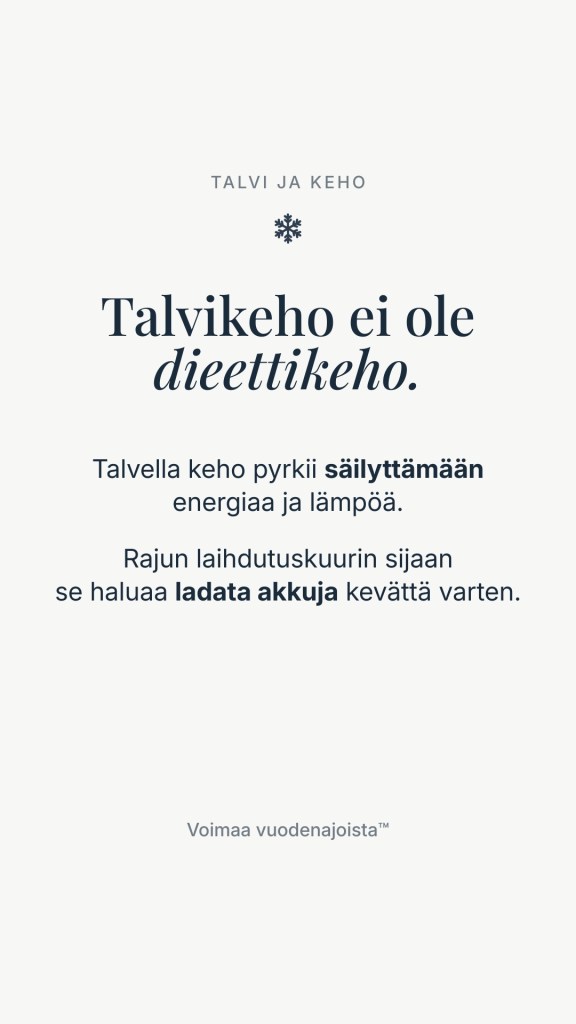 Meissä näkyy sama liike: kaipaamme enemmän unta, hitaampaa tahtia ja lämpöä. Kun tämän talvikehon päälle asetetaan tiukka tammikuun dieetti ja intensiivinen treeni, syntyy ristiriita. Kehoa pyydetään kuluttamaan varantojaan juuri silloin, kun sen luontainen tarve olisi kerätä ja suojella niitä. Siksi laihdutus talvella tuntuu monesta raskaammalta kuin sama työ keväällä.